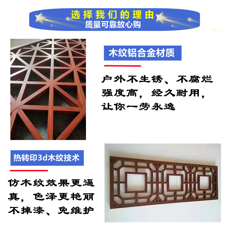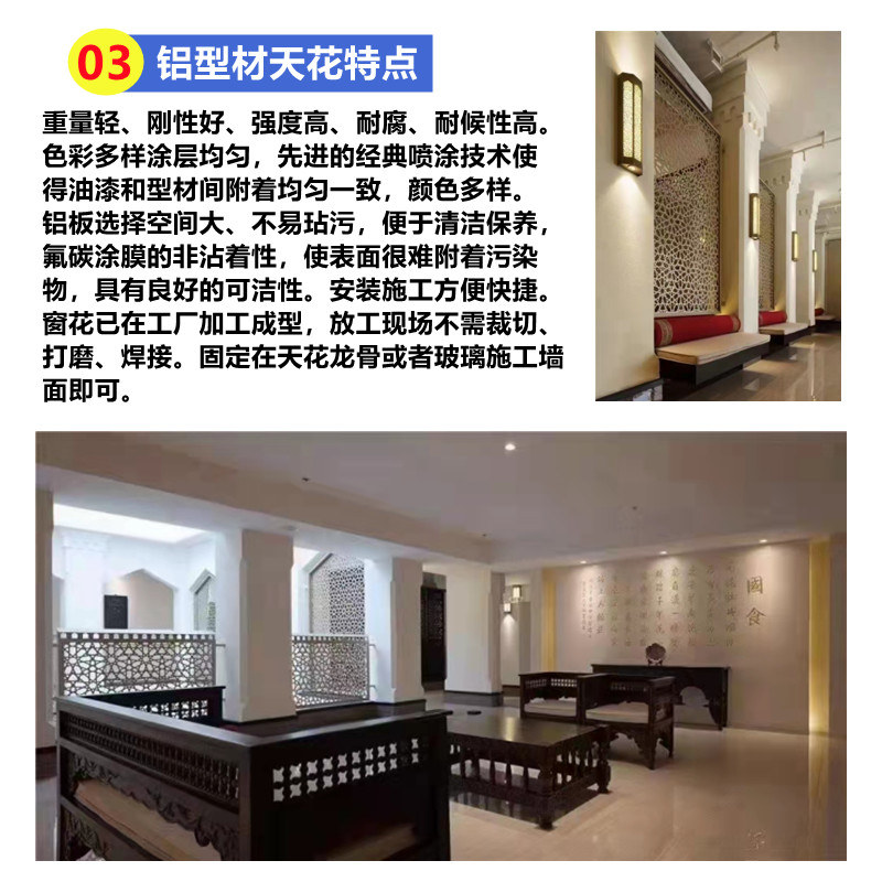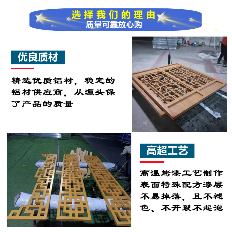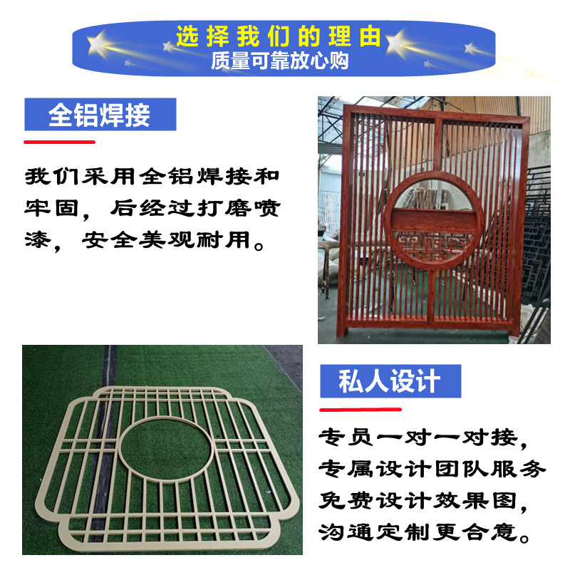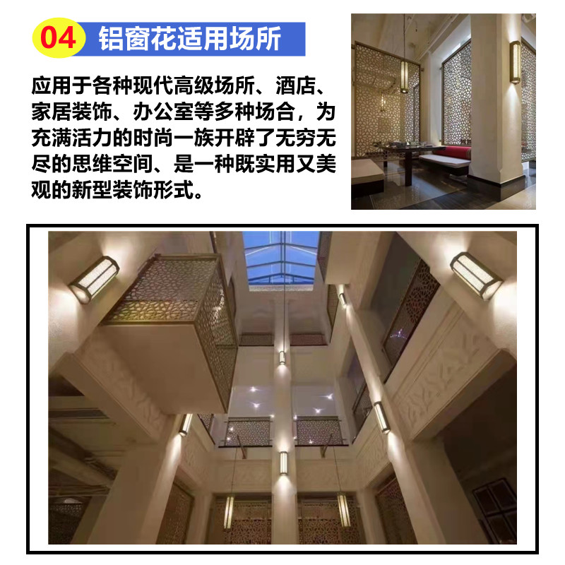 鋁合金打造獨具現代化的仿古門窗屏風隔斷,將中華傳統的古典一直傳承下去。精致雕刻,是現代化的氣息,更是